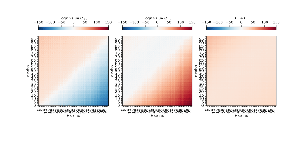 This is not surprising. The biases set the baseline logit value of the + token to 18.6 and the baseline logit value of the – token to 6.21. So without information about the tokens, the model assumes that the + token is the right prediction after the = sign. Since I’ve set up my values to list 0 as a positive value (e.g., ), 50.5% of all possible inputs will start with a + sign, so the model hedges and makes that the default.