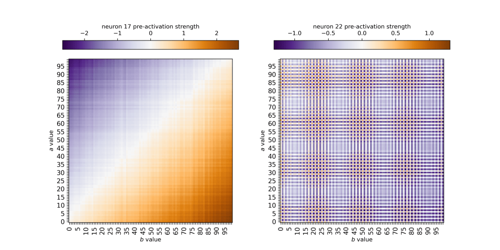 I also want to briefly note that many neurons are somewhat polysemantic — they contain both the linear and oscillatory features shown above. This isn’t surprising but let’s ignore it for now.