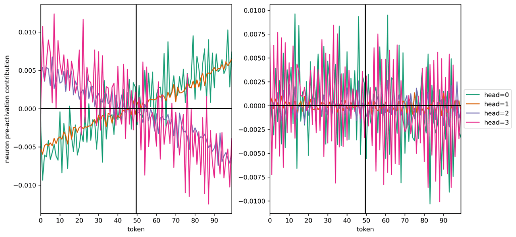 So we see that heads 1 and 2 make a predominantly linear contribution to the neuron pre-activations with little variance, while heads 0 and 3 contribute with a lot of high-frequency oscillations on top of a linear trend. For one of the neurons that’s important to the token (neuron 17, on the left), all four attention heads have a strong linear trend, and heads 0 and 1 share a slope which is opposite that of heads 2 and 3. On the right (a periodic but not important neuron for the