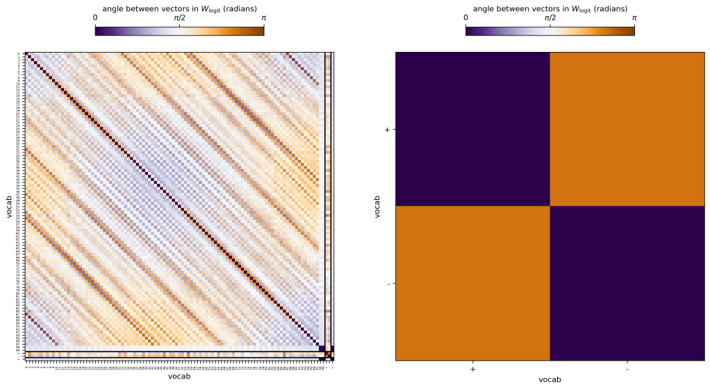 Above, the left panel shows the angles between each vector and each other vector (so the top row is the angle between 0 and every other token along the x-axis, for example). Dark purple means the vectors are aligned, dark orange means they’re anti-aligned, and white means they’re perpendicular. The diagonal is purple definitionally, but it’s interesting that most of the numbers are at least partially aligned with one another.