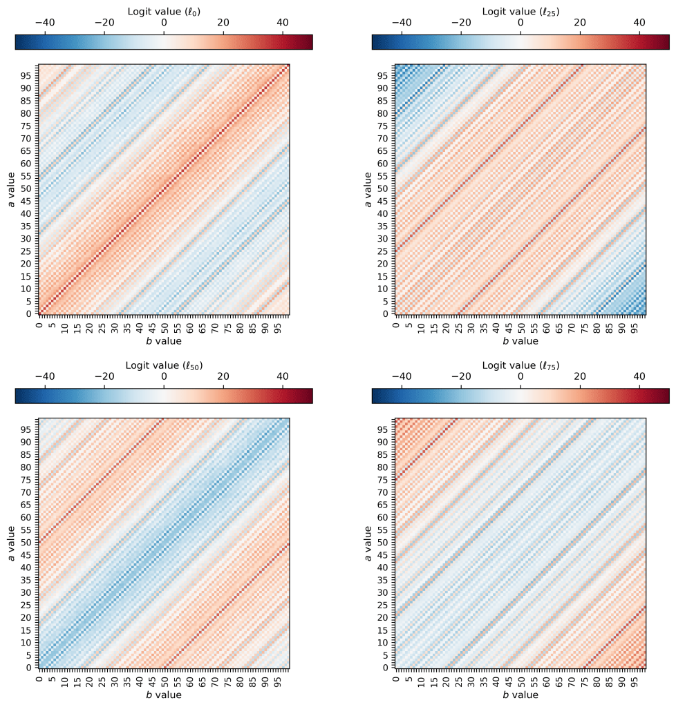This also makes intuitive sense: along the diagonals in the (a, b) plane I’ve plotted above, the result of subtraction is always the same! If you increase a by one and also increase b by one, the difference between the two remains the same. So it makes sense that the model would learn a solution that varies and oscillates in the (a-b) direction but which is perfectly constant along the direction perpendicular to that. Neat!