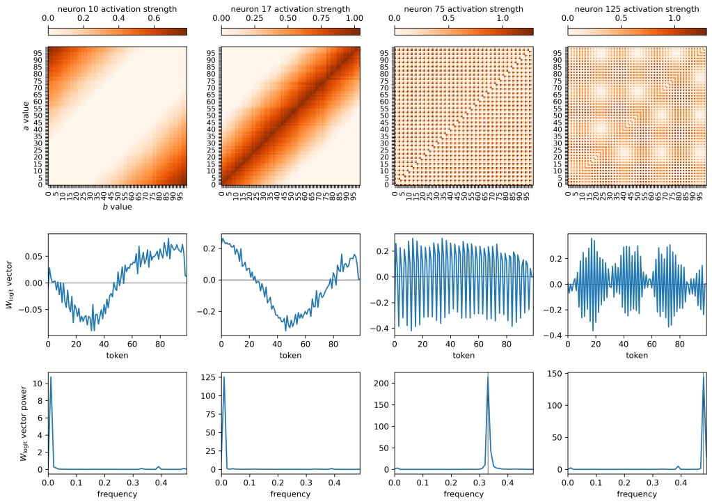 There are a number of neurons like neuron 10 on the left. This neuron in particular suppresses low-value logits and boosts high-value logits when a and b are both large (this can be read off from a combination of the top and middle row plots). Neuron 17, in the second row, boosts the logit values of small number tokens and large number tokens (the latter of which seems like an error in what the model learns?) but suppresses intermediate valued tokens when a and b are similar in magnitude and are both small. In both cases, the dominant frequency in the vector is 0.01, because it contains one smooth sinusoidal feature which throttles some tokens and boosts others.