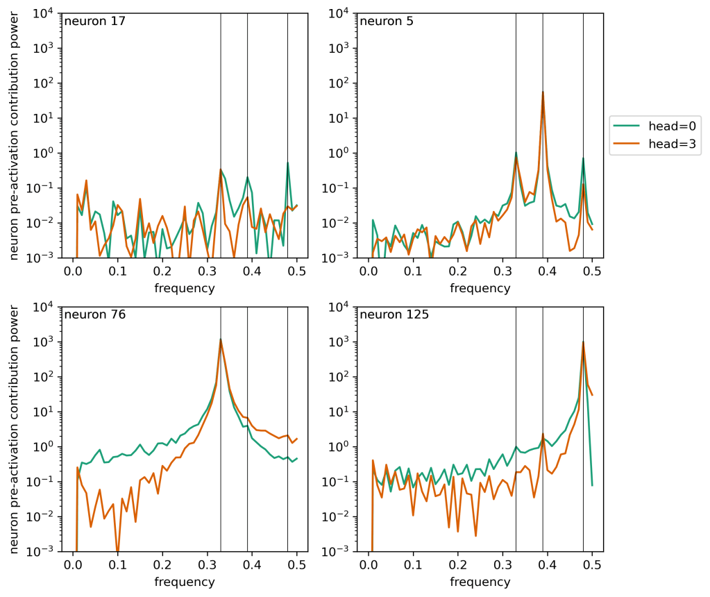 So neuron 17 basically contributes linearly, and many other neurons have different types of oscillations. If we fit a line to each head’s contribution to each neuron, subtract that, and then transform these signals into frequency space, we can form the following power spectra: