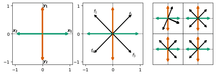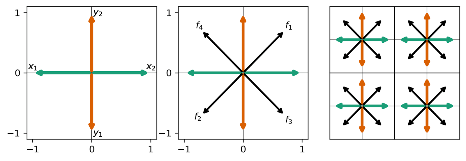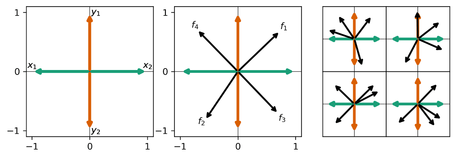 - For example, consider the case where we have two vectors that are aligned, and two vectors that are perpendicular, like in 3 of the panels in the figure below. One of the two aligned vectors has an angle of 0°, 90° , and 90° with the other vectors (cosine sims = 1, 0, 0). Rotating one of the aligned features to a more useful position requires it to pass through a spot where the angle between it and the three other features are 45°, 45°, and 135° (cosine sims = 1/√2, 1/√2, and −1/√2). If we sum up the absolute values of the cosine sim, this rotated vector has a higher abs(cos-sim): 1 < 3/√2, so the vectors stay collapsed and it doesn’t rotate around to a more useful location in activation space.