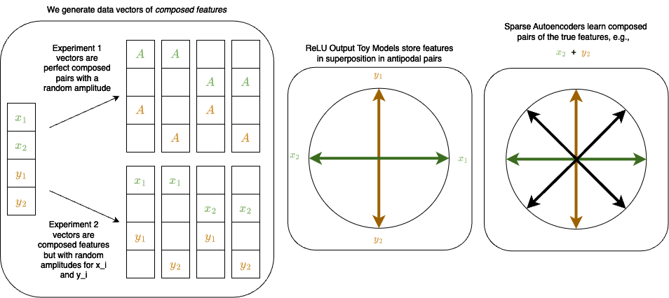 In this blog post, we’ll focus on question #1 in an extremely simple toy model (Anthropic’s ReLU output model with 2 hidden dimensions) to argue that, yes, SAEs definitely learn composed (rather than true) features in a simple, controlled setting. We release the code that we use to create the models and plots in the hope that we as a community can use these toy models to test out different approaches to fixing this problem, and we hope to write future blog posts that help answer question #2 above (see Future Work section).